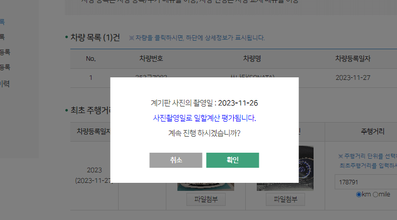 4. 차량 번호판 사진 및 계기판(주행거리 확인) 사진을 첨부하고, 최초주행거리를 입력 후 '등록'을 누릅니다.