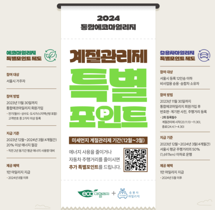 한편, 서울시 에코마일리지는 12월부터 3월까지(4개월) 계절관리제 특별포인트를 지급하는 이벤트를 실시하고 있습니다. 에코마일리지와 승용차 마일리지 모두 해당되며 위 기간 동안, 에너지와 차 사용량을 일정 부분 줄이게 되면 추가 마일리지(각각 1만 마일리지)를 지급 받을 수 있습니다.