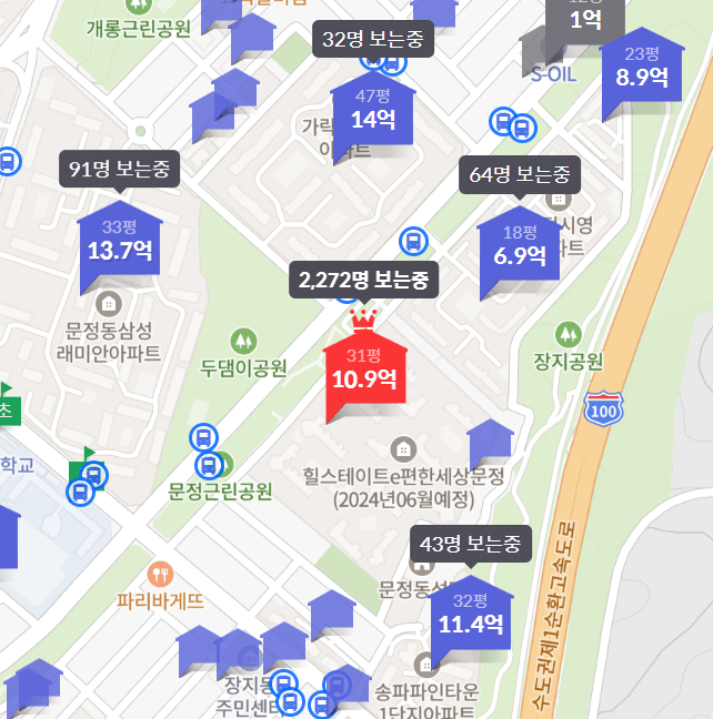 주변 아파트 중 가장 최근에 지어진 단지입니다. 32평 기준 11.4억의 호가를 형성하고 있습니다.